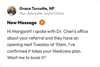 Your advocate coordinates referrals, follows up, reviews medications, and stays with you. As long as you need.